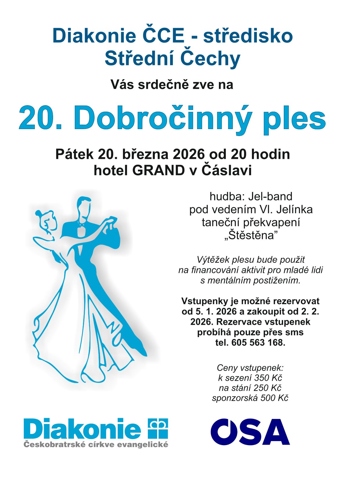 Diakonie ČCE – středisko Střední Čechy zve milovníky tance, dobré hudby a hlavně dárce s velkým srdcem na 20. dobročinný ples. Těšit se můžete, že k poslechu i tanci zahraje kapela Jel-band, a nemine vás ani taneční překvapení s výstižným názvem "Štěstěna". Výtěžek plesu bude použit na financování aktivit pro mladé lidi s mentálním postižením.