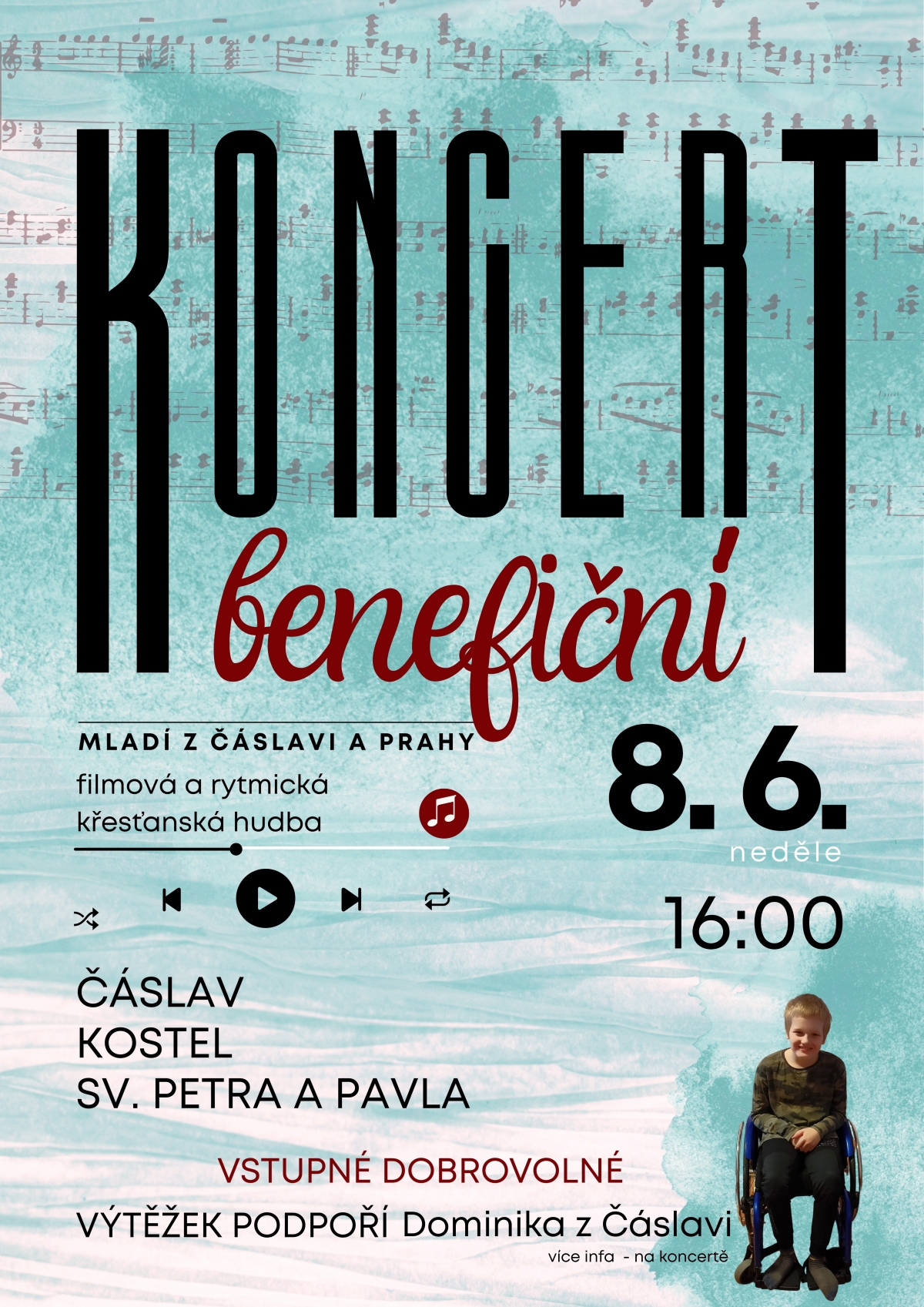 Mladí z Čáslavi a z Prahy filmová a rytmycká křetanská hudba zahraje benefiční koncert v kostele sv. Petra a Pavla dne 8.6 2025 v 16 hodin.