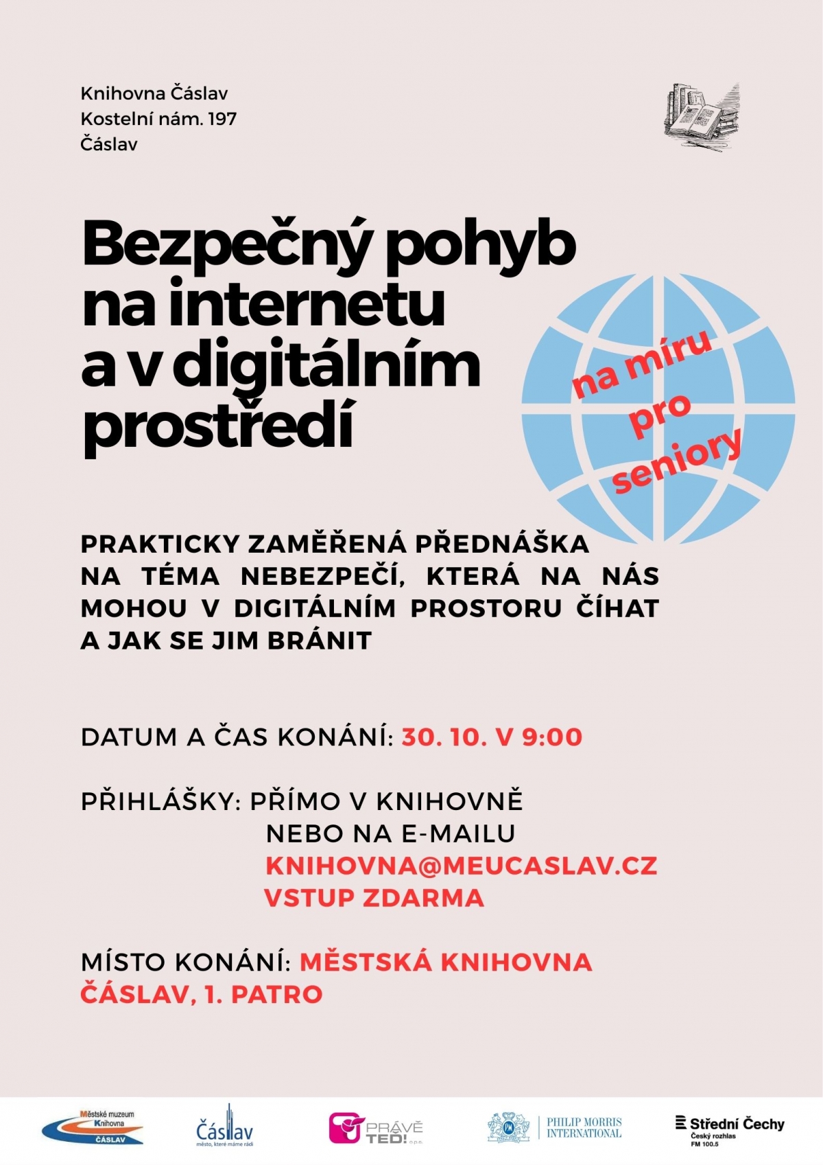 Městské muzeum a knihovna Čáslav zvou veřejnost na přednášku věnovanou bezpečnému pohybu na internetu. Akce se uskuteční v prostorách knihovny dne 30.10. 2025 od 9:00 hodin.