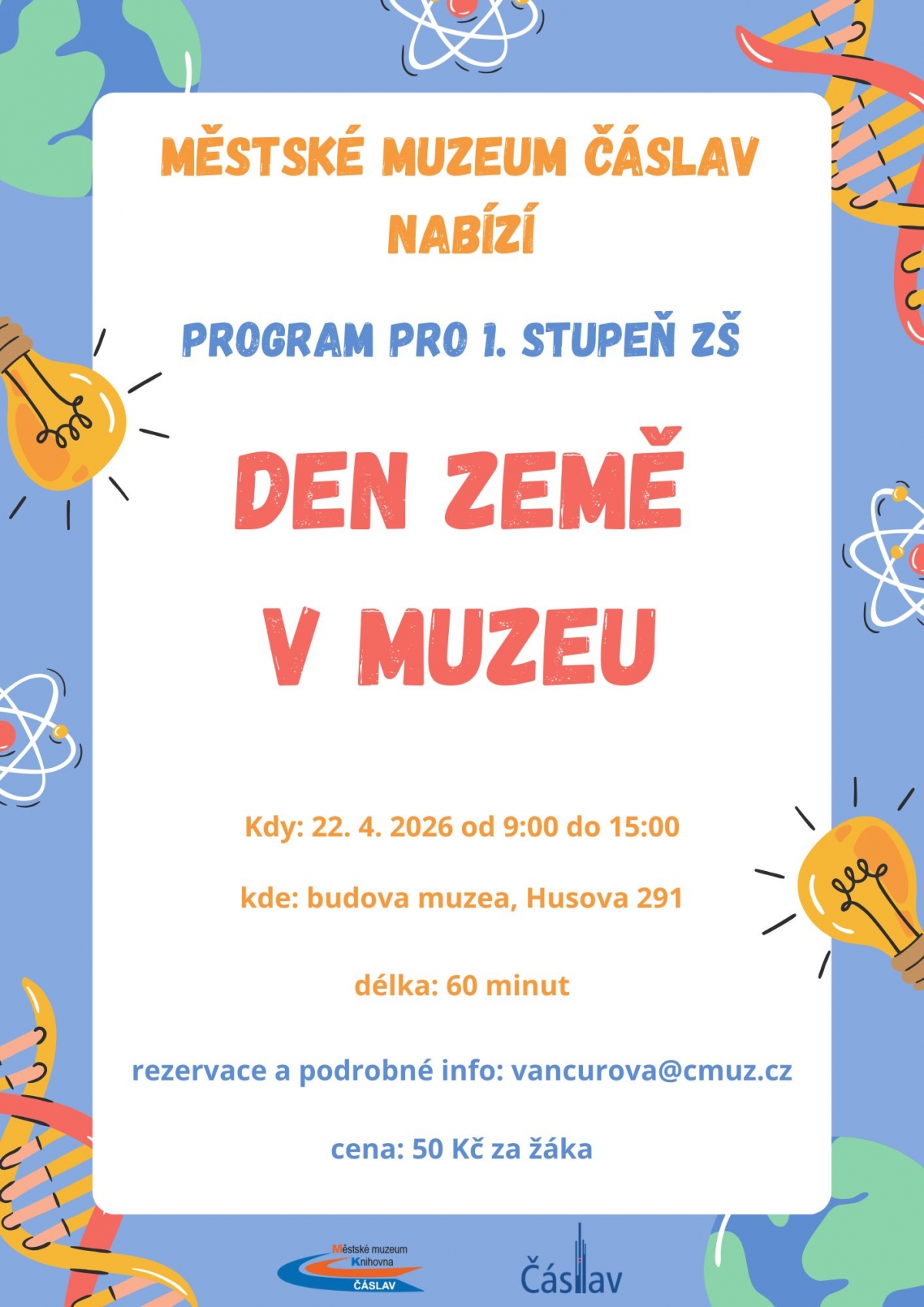 Městské muzeum Čáslav pořádá vzdělávací program určený žákům 1. stupně ZŠ. Žáci tak mohou zažít Den země v muzeu, dozvědět se zajímavé a užitečné informace a rozšířit své znalosti nenásilnou formou.