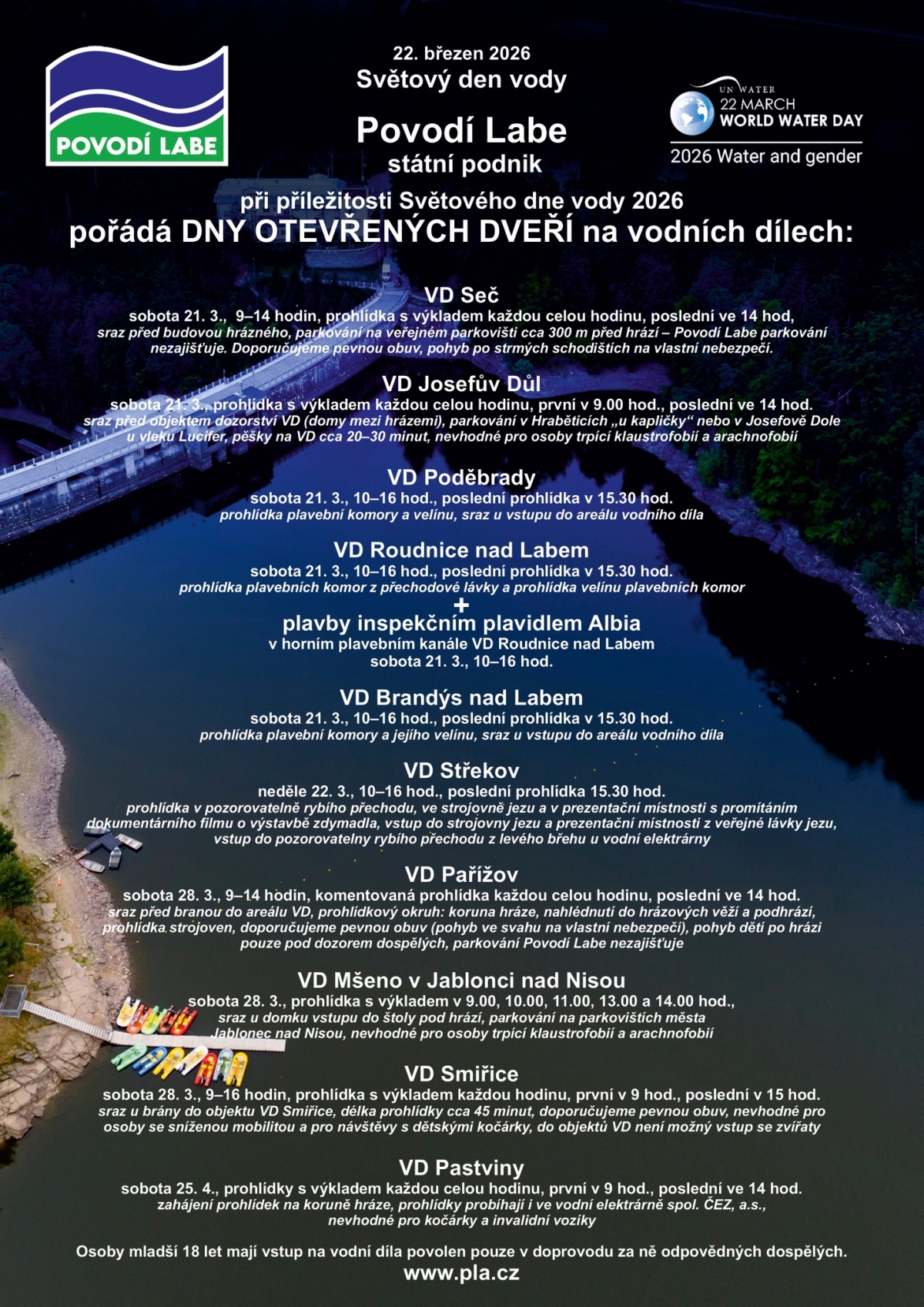 Povodí Labe státní podnik zve u příležitosti Světového dne vody letošního roku na oblíbené a hojně navštěvované Dny otevřených dveří na vodních dílech. Nahlédněte do lidskému oku nepřístupných míst vodních nádrží, hrází a strojoven.
