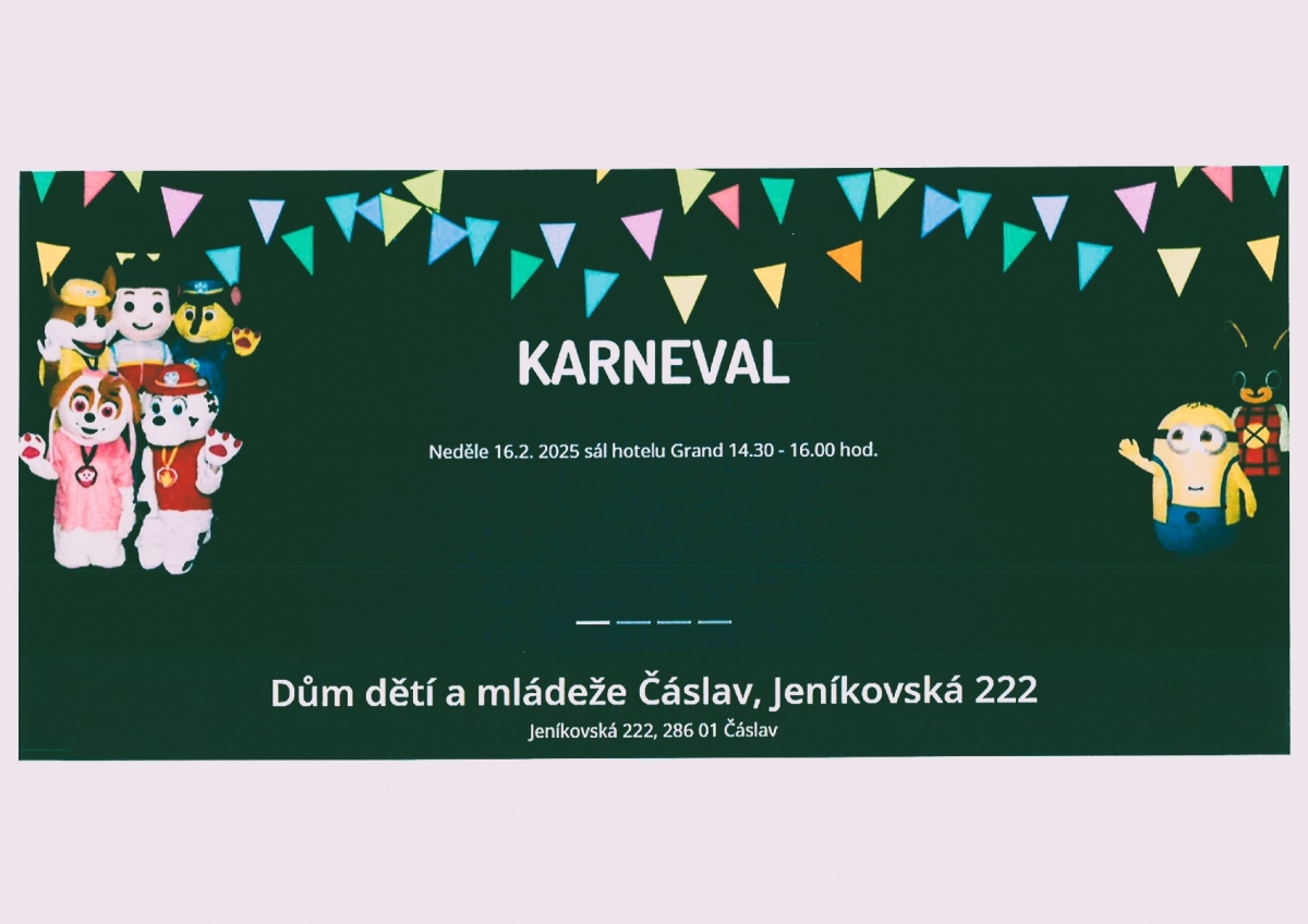 DDM Čáslav připravilo v neděli 16.2. 2025 od 14.00 hod. Karneval, sál hotelu Grand bude pro malé i velké zájemce. Pro děti bude od 14.30 hod. v rámci programu připravena tombola, dětská diskotéka a soutěže s maskoty Tlapkové patroly a s postavičkami Mimoně a králíčka Binga. Program bude ukončen v 16.00 hod.
