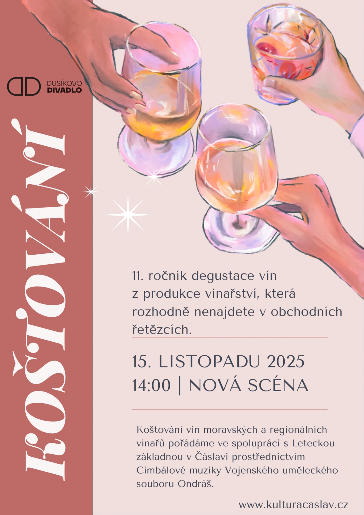 Dusíkovo divadlo Čáslav srdečně zve 15.11. od 14:00 hod. na již 11. ročník degustace vín z produkce vinařství, která rozhodně nenajdete v obchodních řetězcích. Koštování vín moravských a regionálních vinařů pořádá ve spolupráci s Leteckou základnou v Čáslavi prostřednictvím Cimbálové muziky Vojenského uměleckého souboru Ondráš. Hudební bloky cimbálové muziky jsou sestaveny z českých, moravských, slovenských, ale i maďarských nebo rumunských lidových písní.