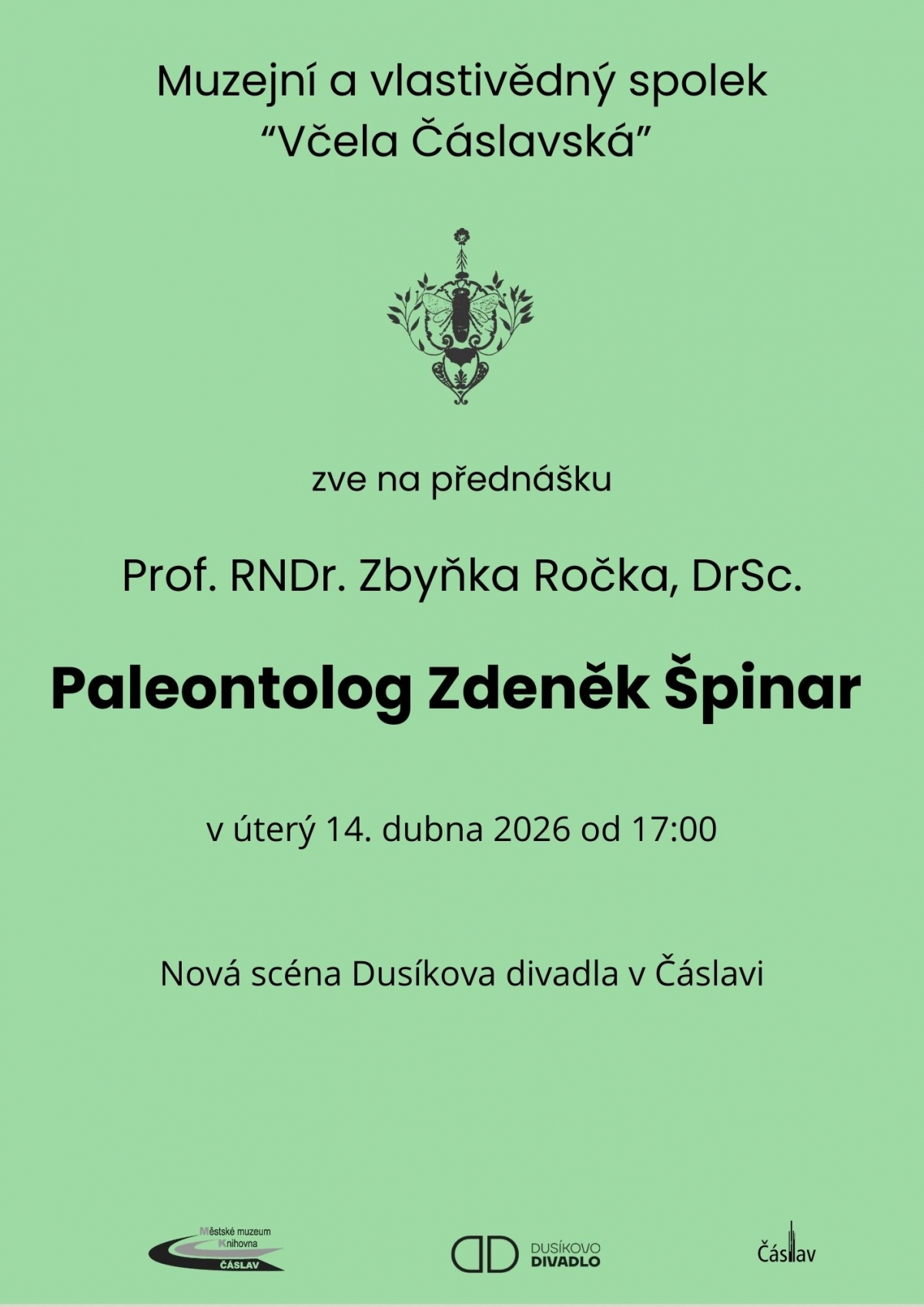 Muzejní a vlastivědný spolek "Včela Čáslavská" zve na přednášku Prof. RNDr. Zbyňka Ročka, DrSc. o Zdeňku Špinarovi, českému palentologovi, spisovateli a odborníkovi na fosilní obojživelníky. Jeho životem, publikací titulů i přínosy pro paleontologii se můžete nechat provést v úterý 14. 4. od 17:00. Vstupné dobrovolné.