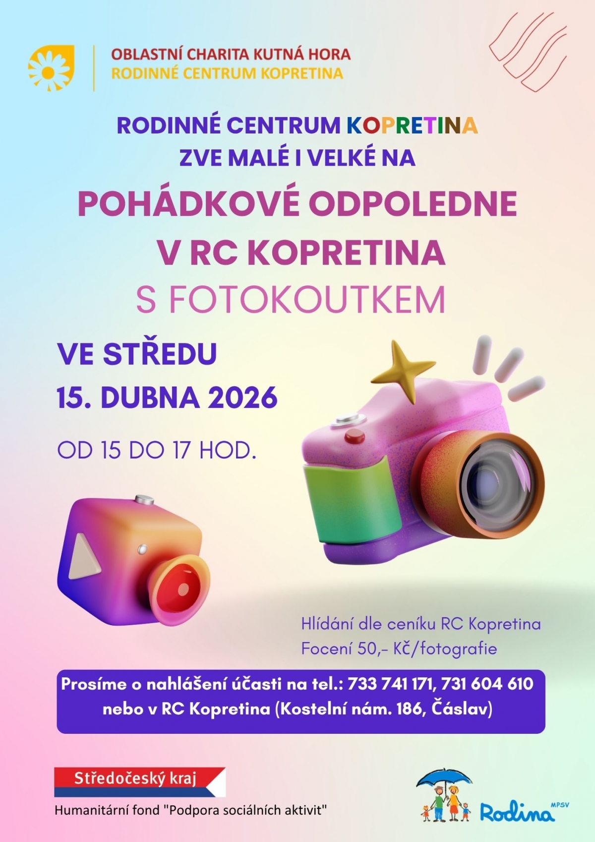 Rodinné centrum Kopretina Čáslav zve malé neposedy a všechny nezbedy na pohádkové odpoledne. Přijďte zahnat nudu a jako bonus si užít s kamarády fotokoutek a odnést si na památku do albíčka společnou fotografii.