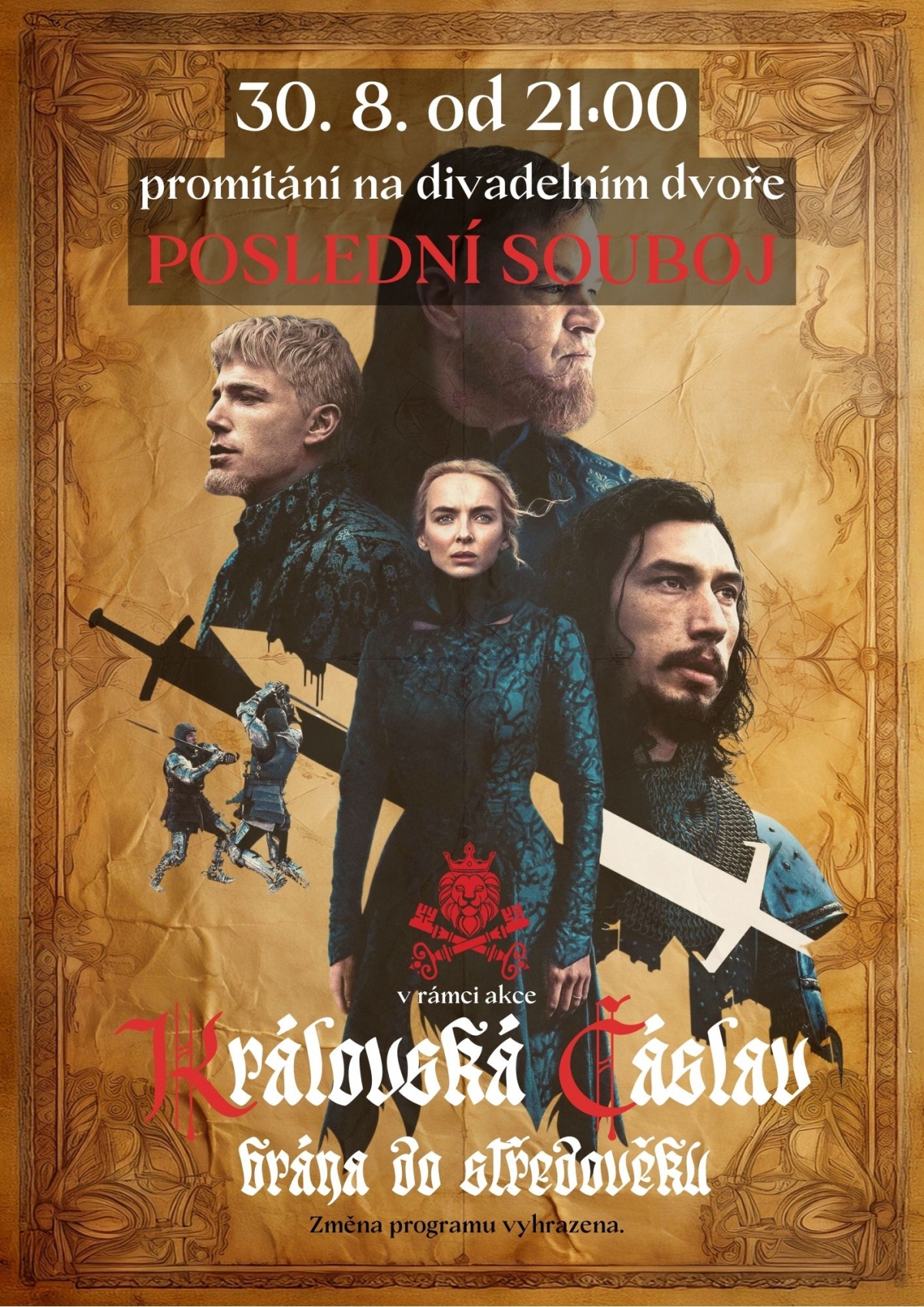Srdečně Vás zveme na pokračování celodenního programu Královská Čáslav - večerní promítání filmu Poslední souboj (historické drama 2021), natočeného podle skutečné události. Tedy v historii, šermířských kláních a krvavých soubojích pokračujeme i po setmění, jen se přesuneme na divadelní dvůr. Vstupné ZDARMA.