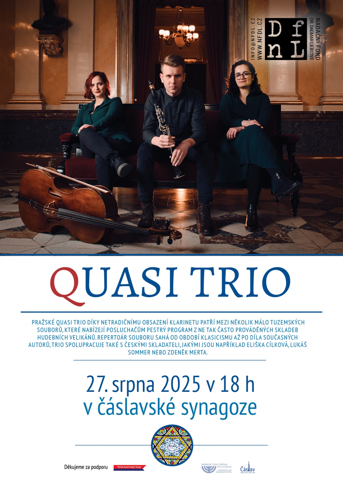 Synagoga Čáslav Vás srdečně zve na koncert Quasi Tria, skvělého tělesa vážné hudby, které vystoupí 27. srpna od 18 hodin na závěr letní sezóny synagogy v Čáslavi.
