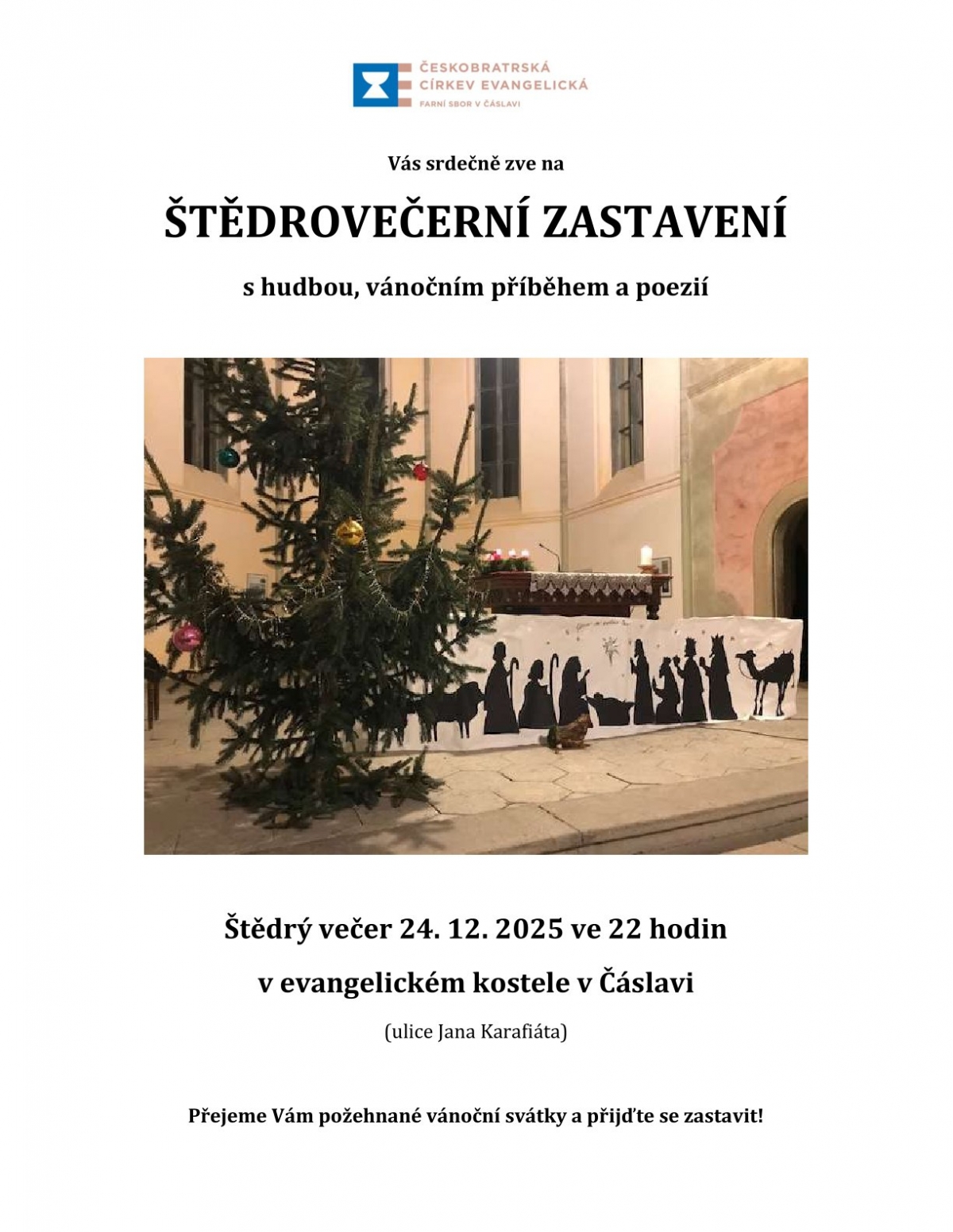 ČCE Čáslav zve na Štědrovečerní zastavení. Vánoční shon skončil, euforie z rozbalování dárků za námi a nyní je čas na to zklidnit mysl i ducha a zastavit se. Navštivte 24. 12. od 22:00 evangelický kostel a zastavte se spolu s ostatními, zahloubejte se do svých myšlenek a poslechněte si vánoční příběh, poezii a hudbu.