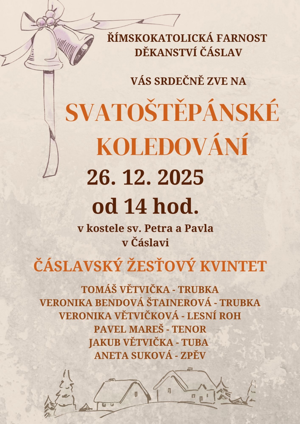 Římskokatolická farnost – Děkanství Čáslav zve na Svatoštěpánské koledování Čáslavského žesťového kvintetu do kostela sv. Petra a Pavla. Přijďte si po Vánočním shonu užít trochu té pohody s příjemnou hudbou na Štěpána 26. 12. od 14:00.