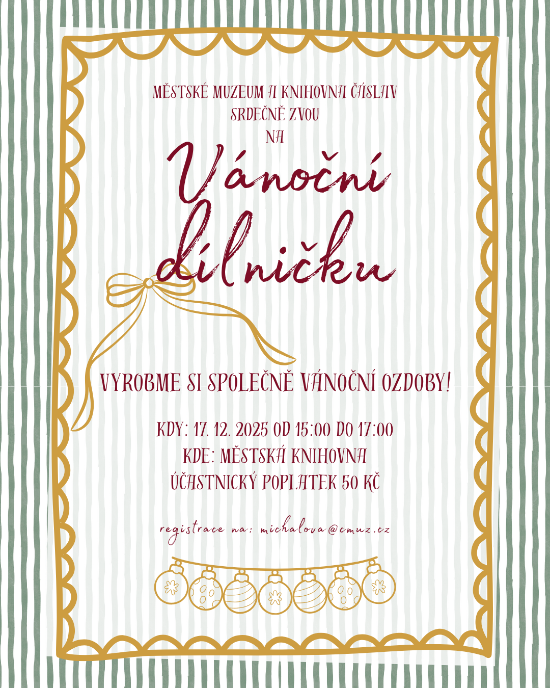 Městské muzeum a knihovna Čáslav zvou na vánoční dílnu s výrobou ozdob. Přijďte si 17. 12. od 15:00 do 17:00 do knihovny vlastnoručně vyrobit ozdobu, která bude o vánočních svátcích zdobit váš stromek.