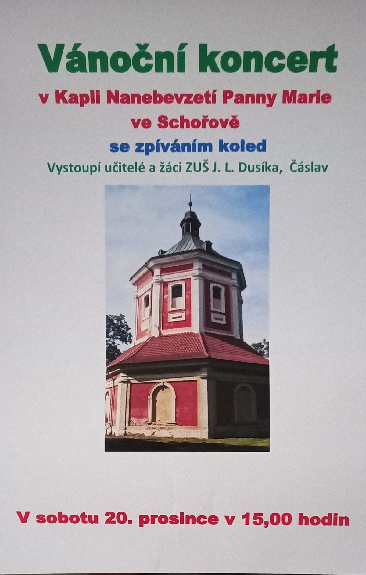 Žáci a učitele ZUŠ J. L. Dusíka Čáslav si připravili soubor vánočních koled, které posluchačům představí v kapli Nanebevzetí Panny Marie ve Schořově v sobotu 20. 12. od 15:00 při vánočním koncertu.