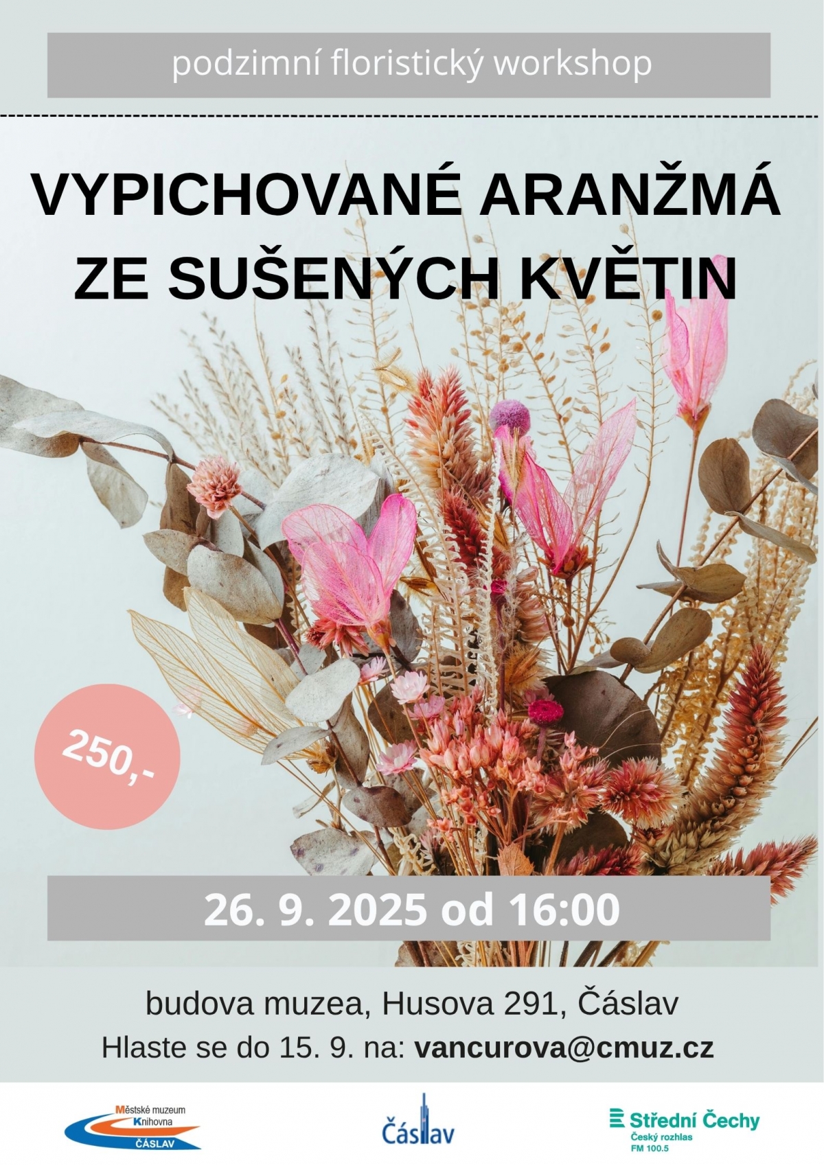 Podzimní floristický workshop - Vypichované aranžmá ze sušených květin se bude konat 26.9. 2025 od 16:00 hod v budově Městského muzea Čáslav, Husova 291.