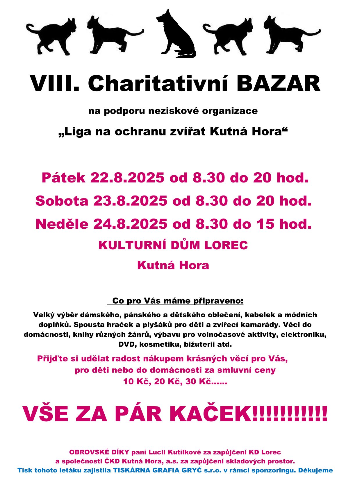 WIII. Charitativní BAZAR na podporu neziskové organizace Liga na ochranu zvířat Kutná Hora se koná ve dnech: