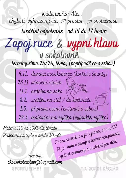 Série tvořivých nedělních odpolední, kdy vypnete hlavu a můžete se nechat unášet na tvůrčích vlnách, pohodového setkání a tlachání je opět tady. Vyberte si z následujících termínů a vždy od 14:00 do 17:00 se dostavte do T. J. Sokol Čáslav.